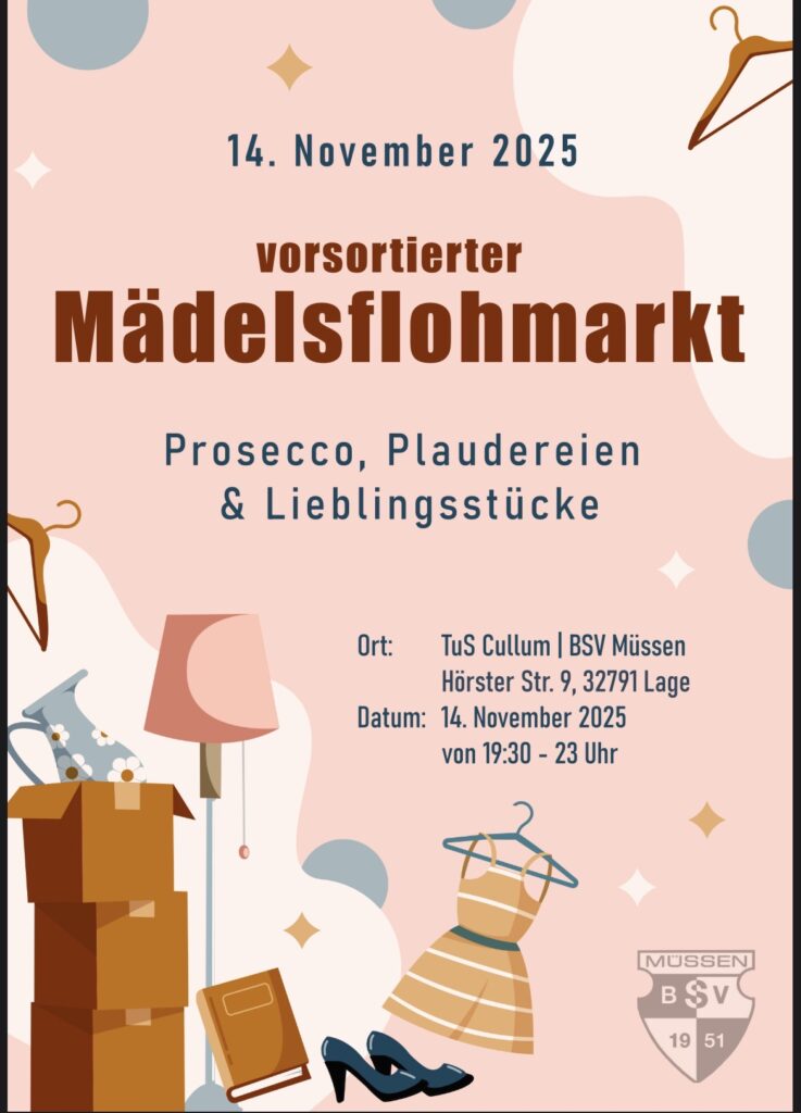 Der BSV Müssen lädt am Freitag, 14. November, ausschließlich Frauen zum ersten vorsortierten Mädelsflohmarkt ins TuS- Culum (Hörster Str.9) ein. 19:30-23:00 Uhr